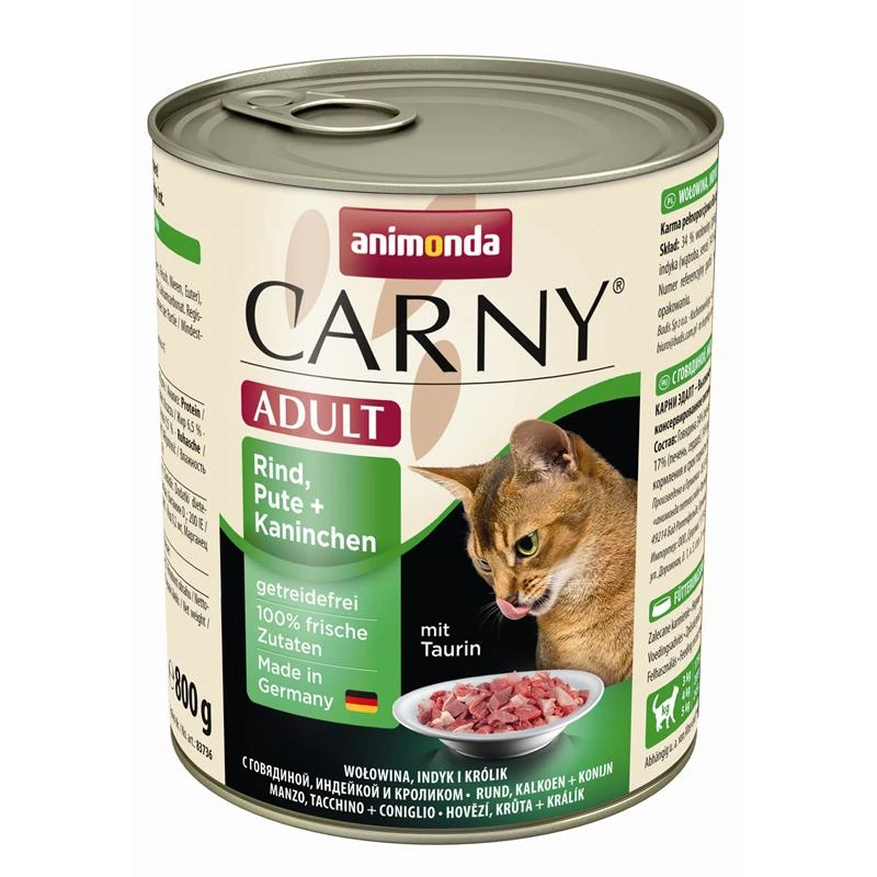 Animonda Carny Adult ist ein gesundes und leckeres Futter, das Ihrer Katze sicherlich schmecken wird. Bei der Herstellung wird streng darauf geachtet, dass nur Zutaten enthalten sind, die Ihre Katze auch wirklich für ein gesundes und langes Leben braucht. Animonda Carny Adult ist ein Futter das selbst dem größten Feinschmecker das Wasser im Mund zusammenlaufen lässt. Es enthält nur Zutaten von höchsten biologischem Wert. Das leckere Futter ist genau auf die Bedürfnisse der Katze abgestimmt und enthält wertvolle Proteine. Die ausgewählten Zutaten sind schonend Zubereitet und nach strengen Vorschriften ausgewählt. Dank der ausgewogenen Mischung erhält Ihre Katze alle nötigen Mineralstoffe und Vitamine, die Sie braucht um gesund zu bleiben. Das Fell wird kräftig bleiben, das Hautbild schön und nebenbei werden die Knochen auch mit wertvollen Mineralstoffen versorgt. Probieren Sie doch auch die anderen leckeren Variationen aus und gönnen Sie Ihrer Katze Abwechslung im Futternapf. Natürlich können Sie das Produkt auch sehr gut mit anderen Futtermitteln kombinieren. Testen Sie einfach was Ihrer Katze schmeckt und wohl bekommt. Stellen Sie Ihr Tier immer langsam auf eine neue Futtersorte um. Bei empfindlichen Katzen kann es sonst zu schlimmen Verdauungsproblemen und Durchfällen kommen.