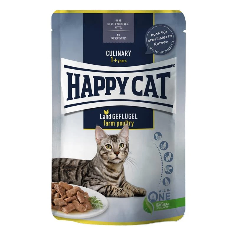Die zarten Häppchen mit leckerer Soße bei Happy Cat Meat in Sauce mit Land-Geflügel verwöhnt ausgewachsene Schleckermäulchen
