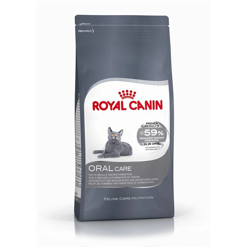Hier stellt Ihnen Zooheld das Trockenfutter Oral Sensitive 30 des weltbekannten Herstellers Royal Canin vor, bei dem es sich um ein ausgewogenes und bedarfsgerechtes Trockenfutter handelt, das einen wichtigen Beitrag zur Unterstützung der Zahnhygiene leistet. Dabei wirkt das schmackhafte Futter, dessen Zusammensetzung Sie unter Details nachlesen können, in zweifacher Weise: Die spezielle Form und Textur der Krokette regt zu intensivem Kauen an, während aktive Wirkstoffe die Zahnsteinbildung reduzieren. Zur Entstehung von potenziell gefährlichem Zahnbelag ist folgendes zu sagen: Samtpfoten haben häufig Zahnbelag oder Maulgeruch, wobei durch die Mineralisierung von Zahnbelag – d.h. die Einlagerung von Kalzium aus dem Speichel in den Zahnbelag – Zahnstein entsteht, in dem auch die gefährlichen Plaque-Bakterien enthalten sind. Diese können, wenn der Zahnstein nicht entfernt wird, zur Zahnfleischentzündung und sogar zum Zahnausfall führen. Entzündetes Zahnfleisch ist nicht nur schmerzhaft und erschwert deshalb die Nahrungsaufnahme, sondern bildet auch die Eingangspforte für die Plaque-Bakterien in den Blutkreislauf, was zu schweren inneren Erkrankungen führen kann. Oral Sensitive 30 besitzt eine spezielle Krokette, durch die Ihre Katze zu intensivem Kauen des Trockenfutters animiert wird, was den manuellen Abrieb von Zahnstein befördert. Neben diesem täglichen Bürsteneffekt, der spürbar zur Reduktion von Zahnbelag und Zahnstein beiträgt, bewirken aktive Wirkstoffe in der Rezeptur, dass das entscheidende Kalzium im Speichel gebunden wird und damit nicht mehr für die Zahnsteiinbildung zur Verfügung steht. In wissenschaftlichen Studien hat Oral Sensitive 30 seine Wirksamkeit nachgewiesen – bereits nach einer Fütterung von 28 Tagen ist eine Reduktion des Zahnbelags bzw. Zahnsteines um bis zu 59 % feststellbar.
